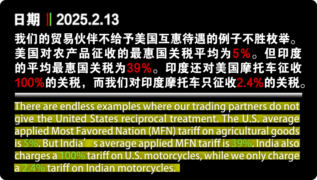 当地时间2月13日,特朗普宣布了最新的关税决定:在未来几周或几个月内对其他国家加征“对等关税”。这意味着,美国的贸易伙伴,全部面临着新的关税威胁。